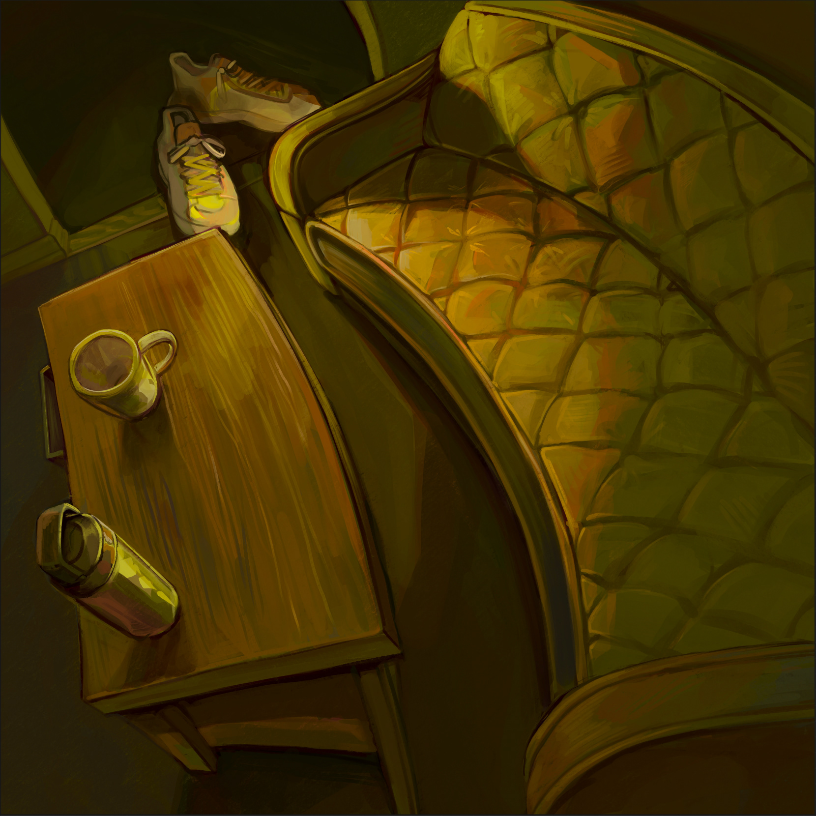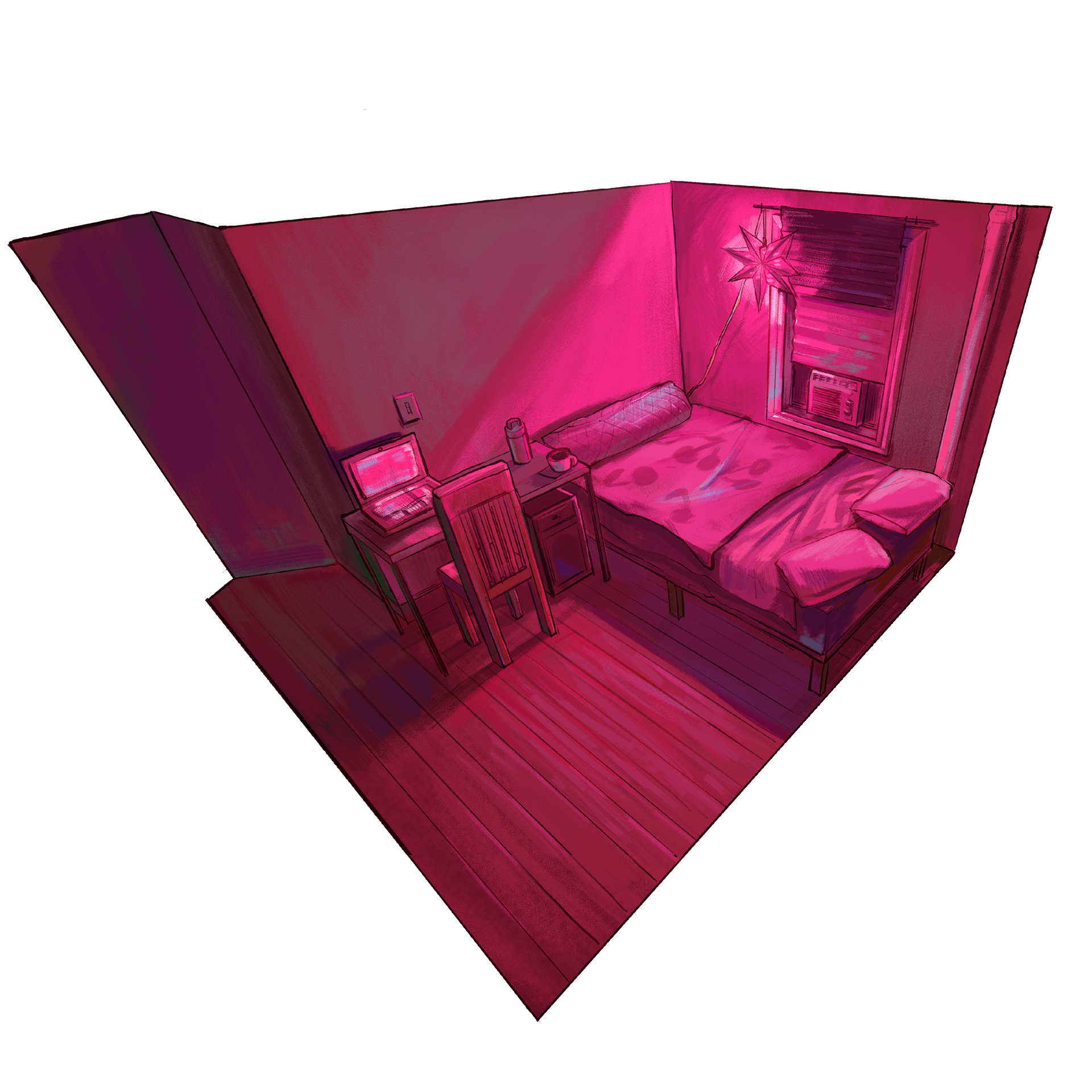 These were drawn from life in an apartment in Brooklyn, New York that I lived at for a few months. The first scene is my bedroom, and I wanted to emphasize the cozy atmosphere of the room with its small size, warm lighting, and inviting bed. The second scene is the living room, and I wanted to portray a creepy, abandoned middle-of-the-night atmosphere with sickly colors and a warped perspective. In both cases, I tried to highlight the essence of the rooms and make the viewer feel how it would be in those rooms.