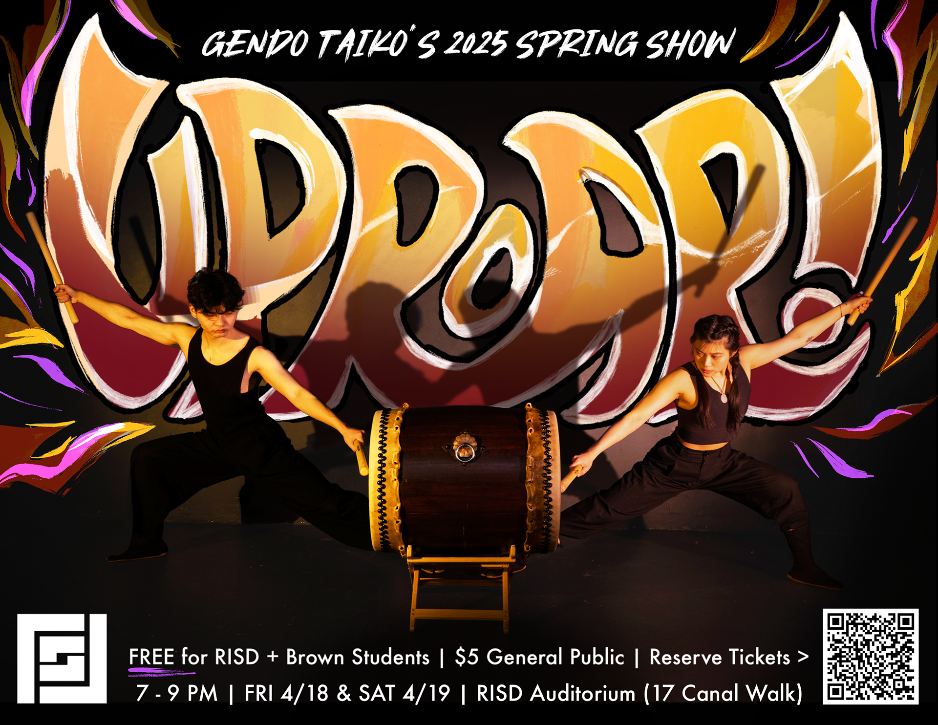 Posters and digital Show Program for Gendo Taiko's 2025 spring show "Uproar"