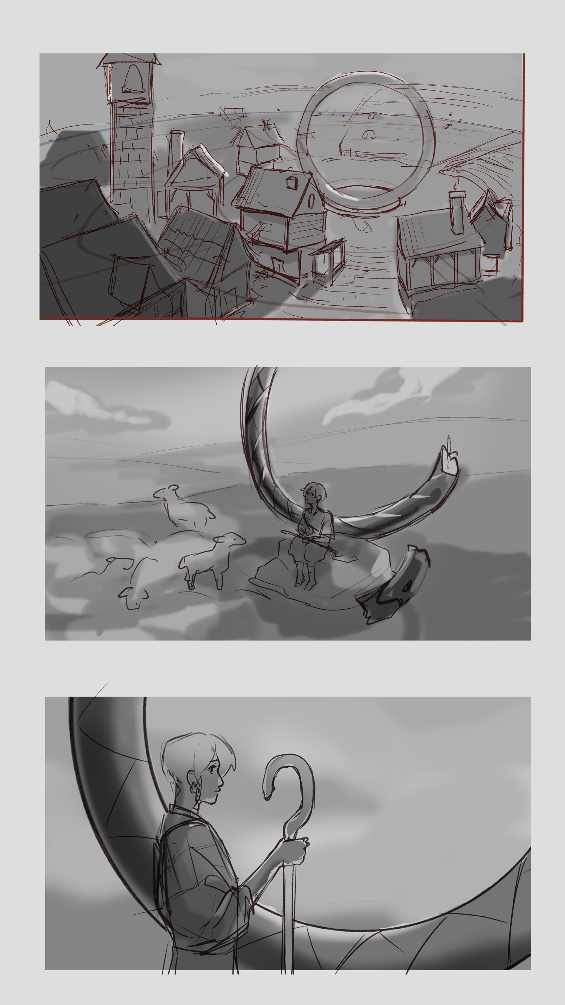 Below are sketches for characters, the world, and accompanying iillustrations.