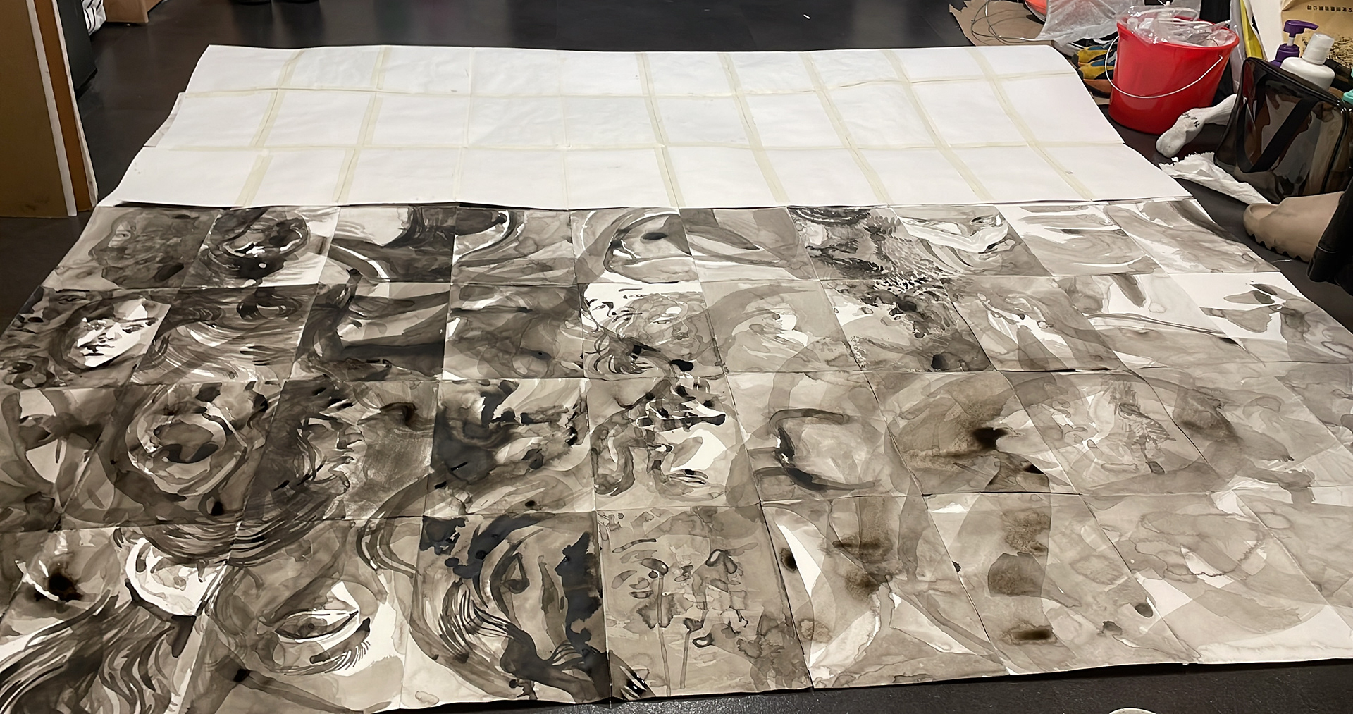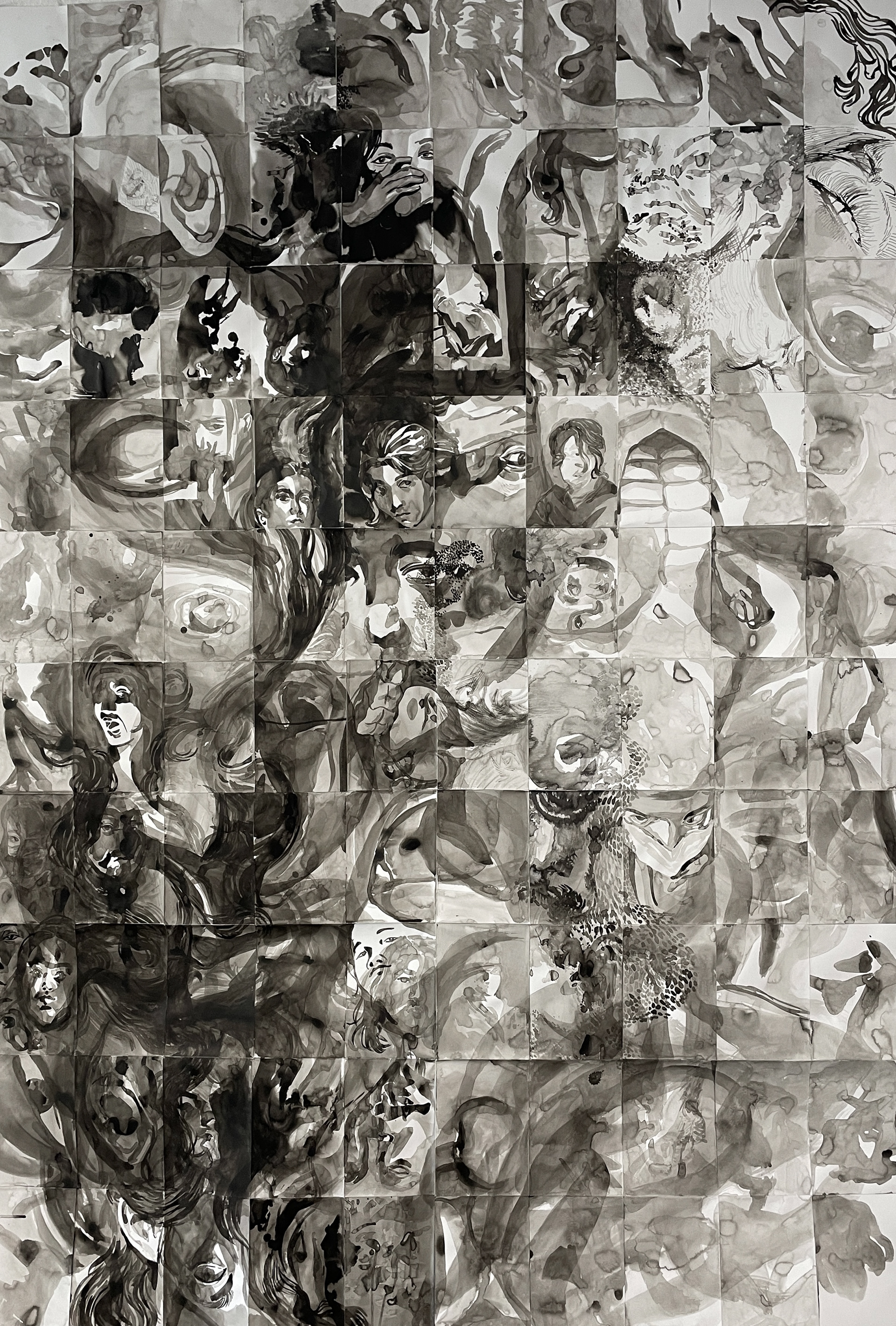 Created for 2022 spring freshman drawing with Norman Paris at RISD. Working within the parameters of a self-portrait in India ink, I drew 100 4"x6" encapsulations of myself, some abstract and some realistic. After completing each individually, I combined them into a grid and reworked it as a whole, adding and modifying to make it flow better as a whole.