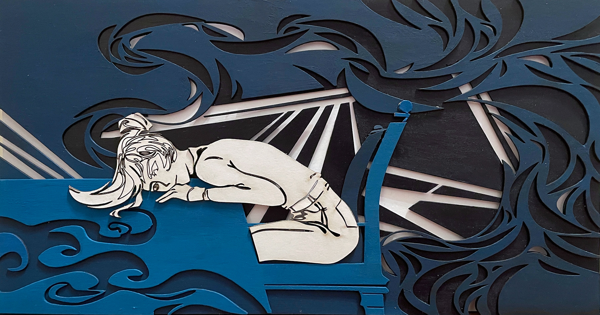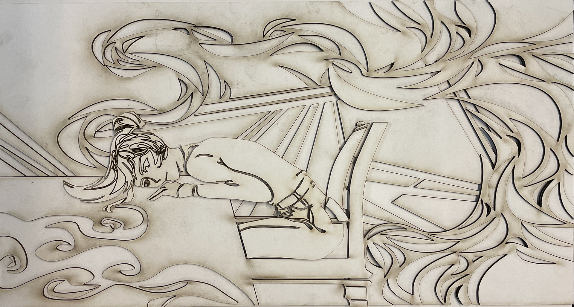 Created in 2021 spring fabrication lab with Juan Cruz at BTWHSPVA. An experiment with a laser cutter, this piece was originally designed digitally with vectors and then cut out onto thin sheets of wood. Afterwards, I painted each layer individually and then assembled them to create one image. Designed as a direct response to the COVID-19 quarantine that interrupted my senior year of high school, I created this piece with themes of depression, stagnation, and art block.