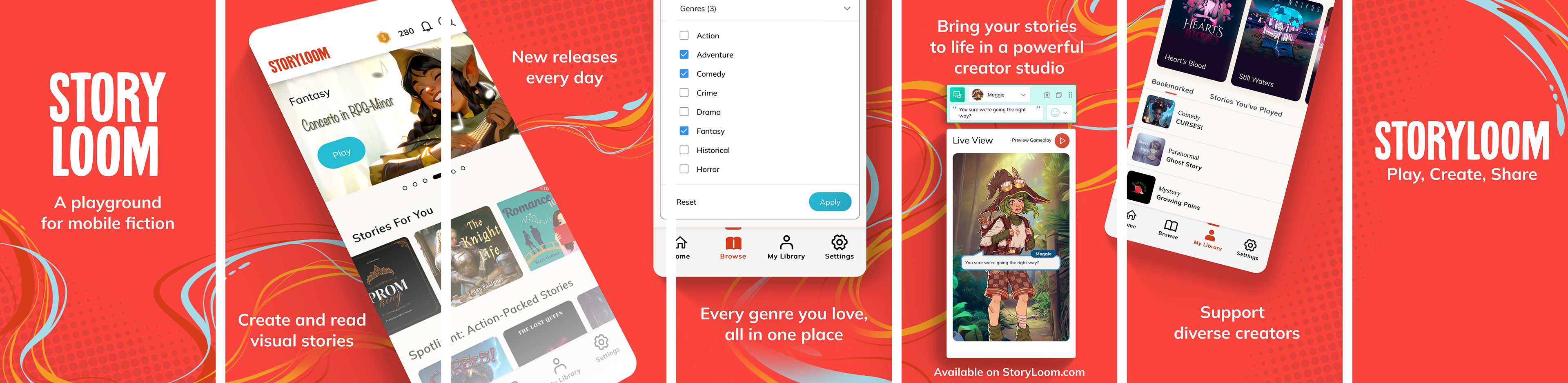 Creating for the StoryLoom app. Using existing assets, I designed a stylish and engaging screenshot roll for the App Store, highlighting the app's capabilities and appeal for use in A/B testing. This project also included a size for extra tall screens and tablet screens.